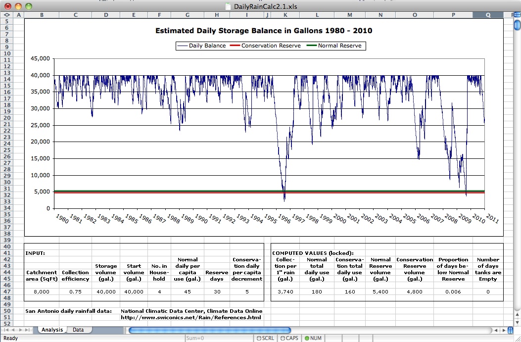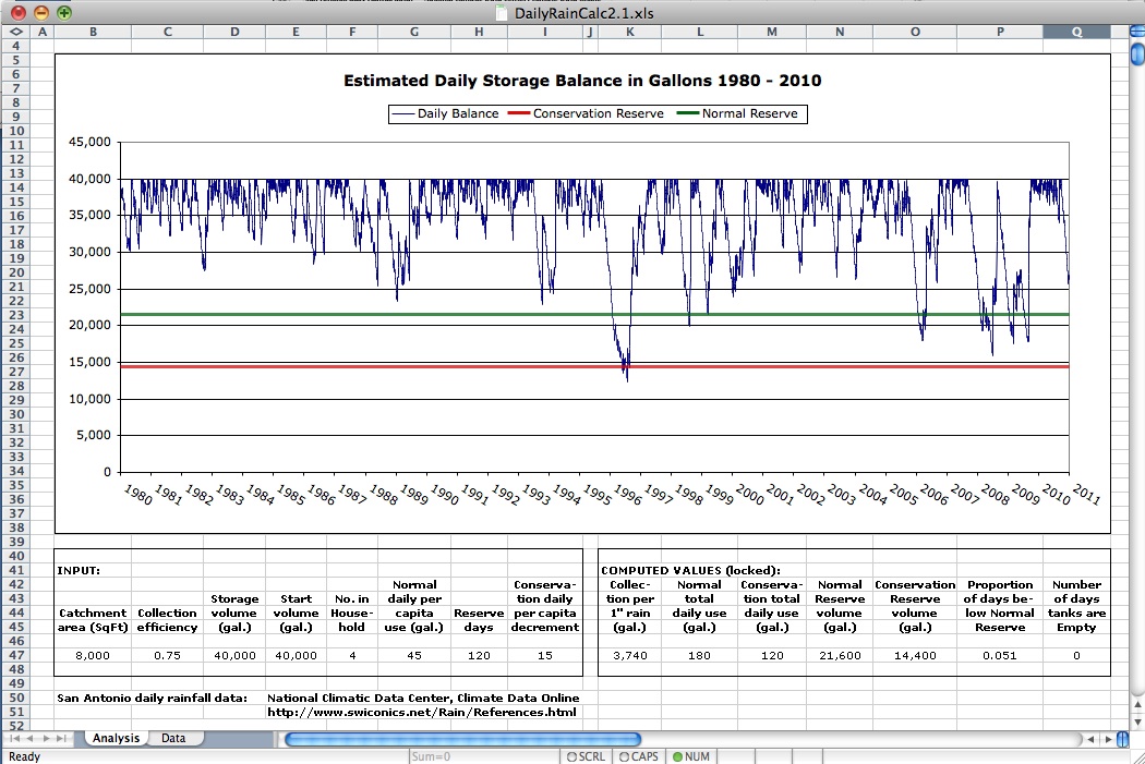 Another result of our measurements was the realization of how much was wasted by letting faucets run until the water became hot, especially those that were located furthest from the hot water heater. It became clear that a recirculating system would be required to correct this problem. On the basis of these estimates and the knowledge that our new appliances would be more efficient than the old, we estimated that a reasonable per capita goal would be 45 gallons per day. DETERMINING STORAGE REQUIREMENTS It was at this point that we turned to the Rainwater Harvest Estimator. After considerable experimentation, we concluded that 40,000 gallons of storage was an acceptable compromise between cost and continuity of supply: