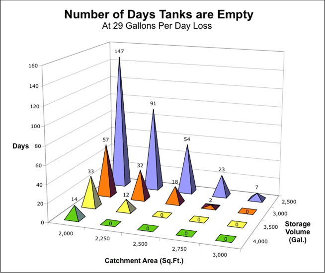 Eight of the combinations of catchment and storage result in zero days of empty tanks, and which potentially could supply enough water to replace loss. But the graph also illustrates some combinations that will not work if rainwater is the sole source. For example, the lowest value for catchment (2,000 square feet) will not supply enough water at any of the storage volume levels. Likewise the smallest tank (2,500 gallons) does not hold enough water to keep from going dry, no matter how much is collected from any of the roof areas shown. Presumably, someone living on property with 2,500 square feet of collection area would want to have at least 3,500 gallons of storage just to be safe.