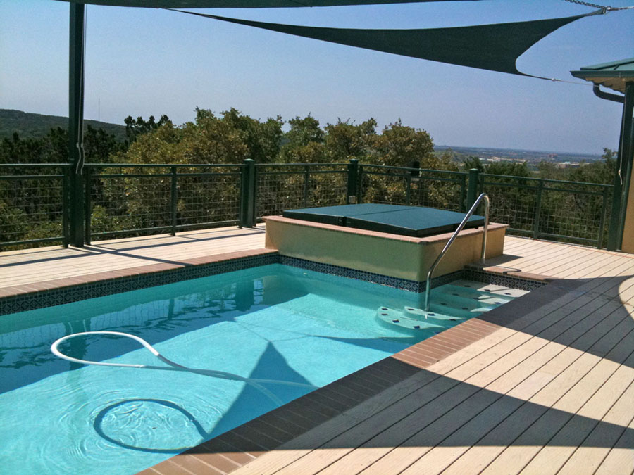 In the absence of other data, it is not certain how precisely this evaporation rate might apply to other seasons or other pools in the South Texas area. Factors that elevate the rate are the record high temperatures the summer of 2011, and the location of the pool from which this rate is calculated, high on a southeast-facing hill where there is a nearly constant breeze. On the other hand, air temperatures at this location tend to be 3 - 5 degrees cooler than at lower elevations, and the pool is protected by carefully placed shade sails that reduce direct exposure to the sun during the hottest part of the day (see photo below). Nonetheless, this measure is consistent with anecdotal reports of water loss in other pools during the warmer months.