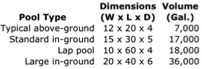 Filling the PoolIf rainwater is to be the sole source of water for an existing pool, storage must be sufficient to tolerate use of thousands of gallons when the pool is filled (or refilled). The table below gives approximate volumes for pools of a few common dimensions (in feet). Depth is estimated as an average of the deepest and shallowest depths.