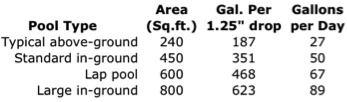 For example, a 1.25 inch drop in level of a typical above-ground pool (240 square feet in surface area) would result in: